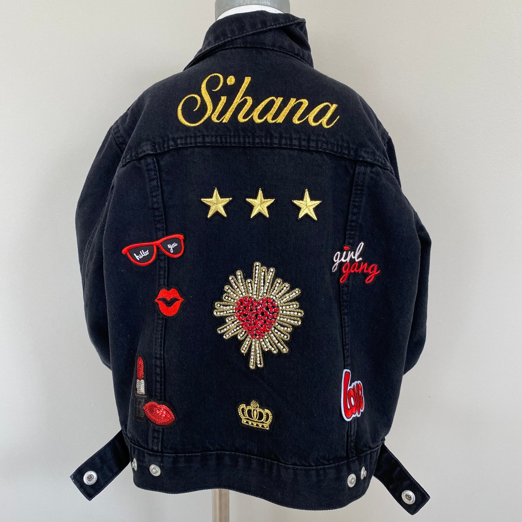 *Jacket on display in the photo is a size 9-10 in Charcoal Black Denim, and the Name Personalisation Font is Script in Metallic Gold thread