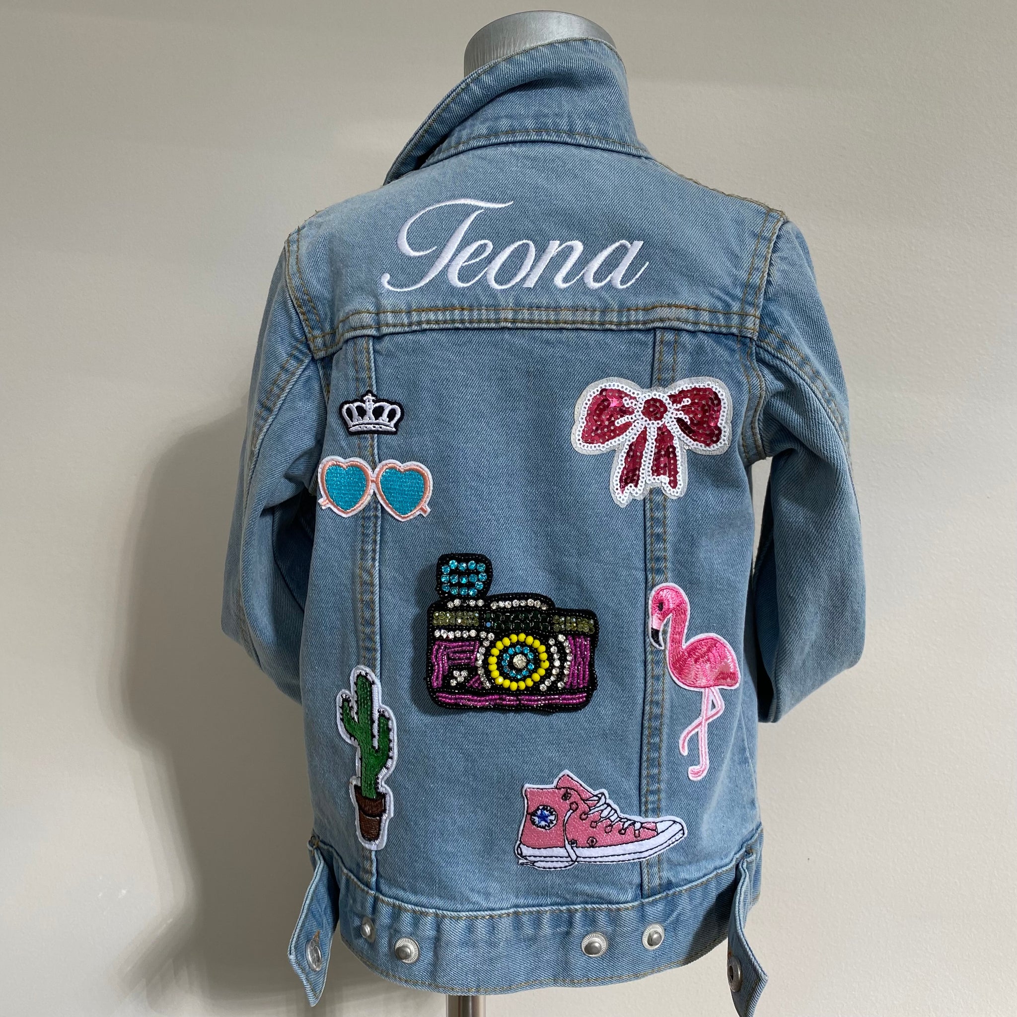 *Jacket on display in the photo is a size 3-4 in Faded Blue Denim, and the Name Personalisation Font is Script in White thread