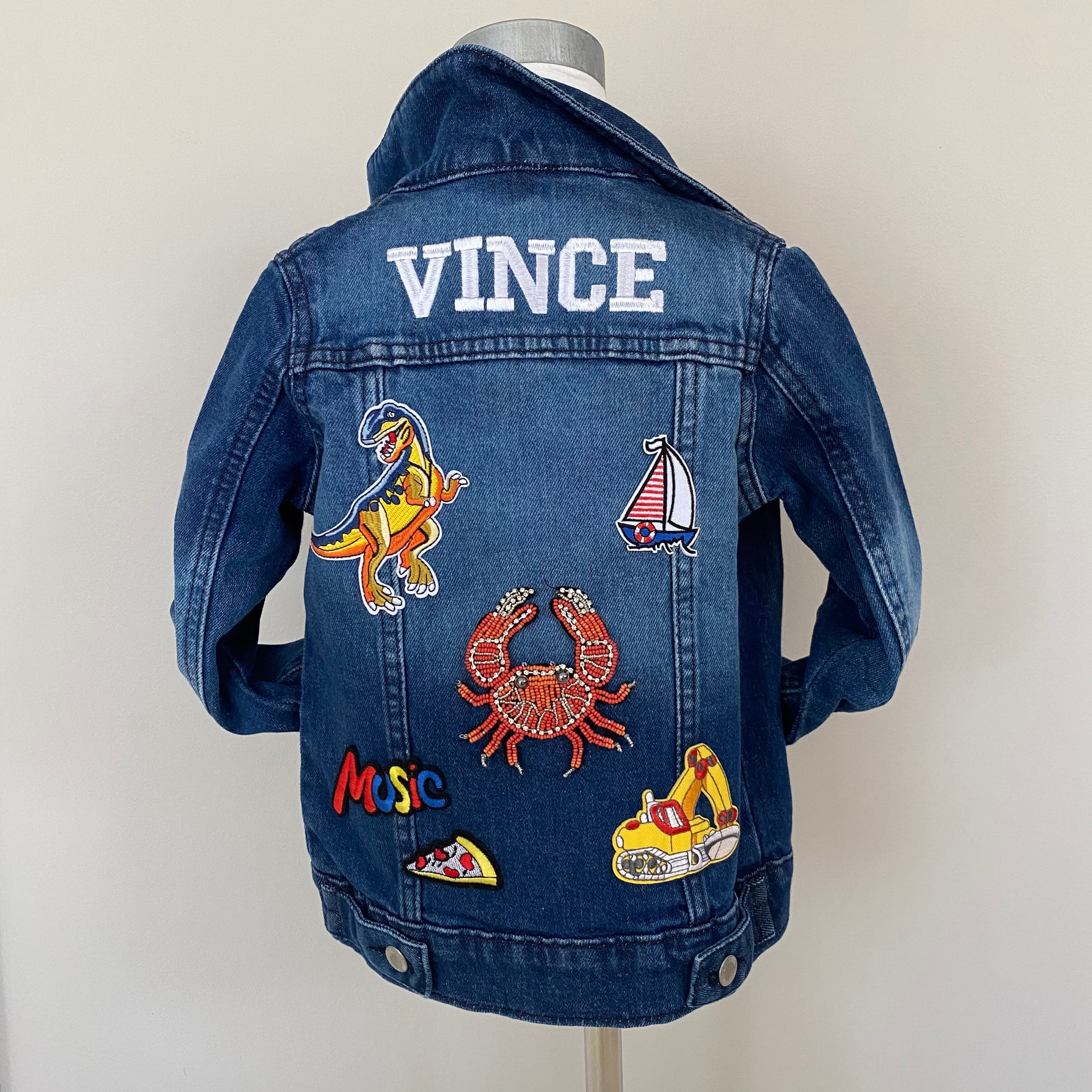 *Jacket on display in the photo is a size 3-4 in Original Blue Denim, and the Name Personalisation Font is College in White thread