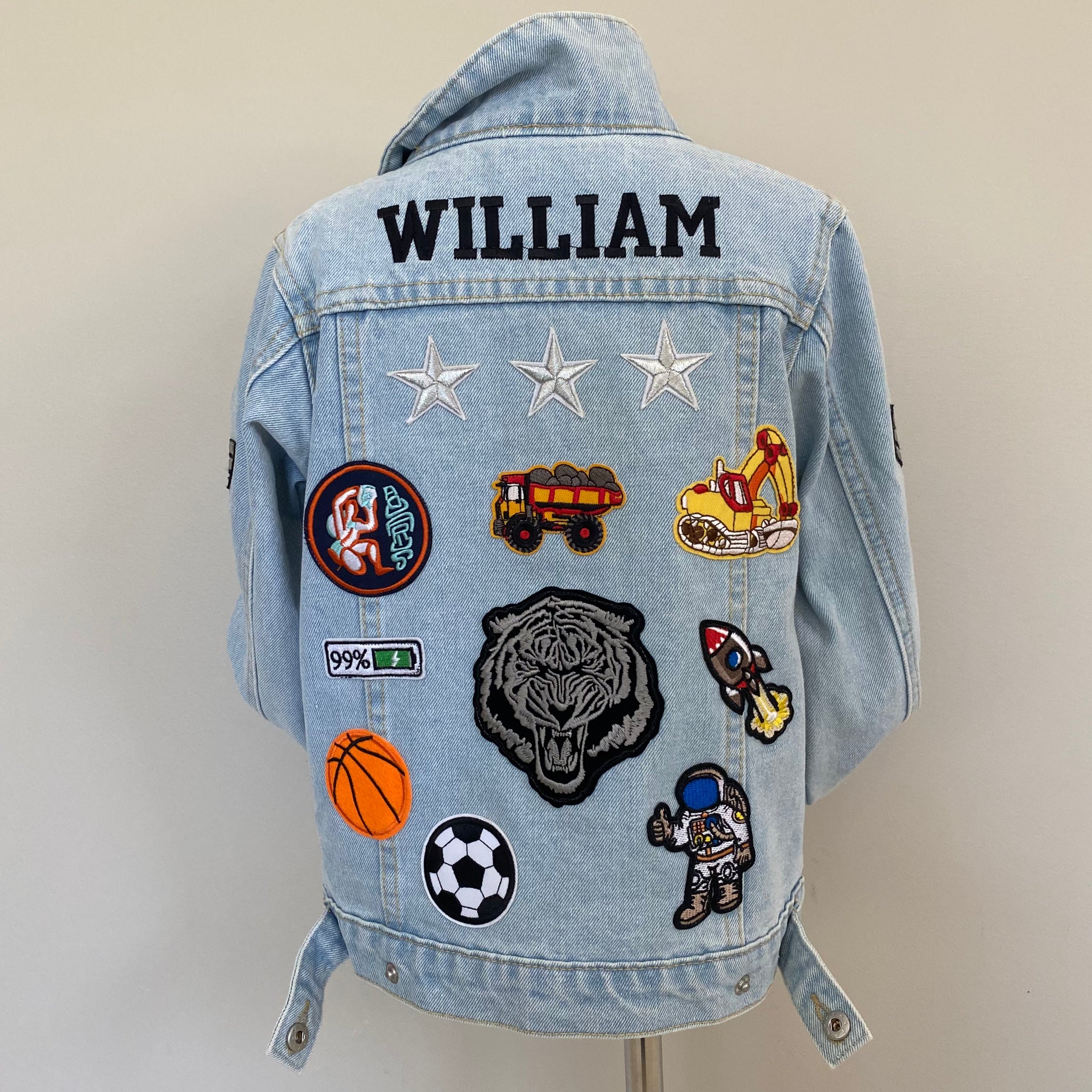 *Jacket on display in the photo is a size 7-8 in Faded Blue Denim, and the Name Personalisation Font is College in Black thread