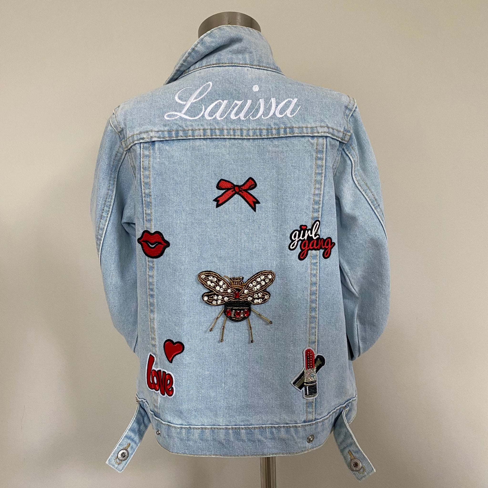 *Jacket on display in the photo is a size 5-6 in Faded Blue Denim, and the Name Personalisation Font is Script in White thread