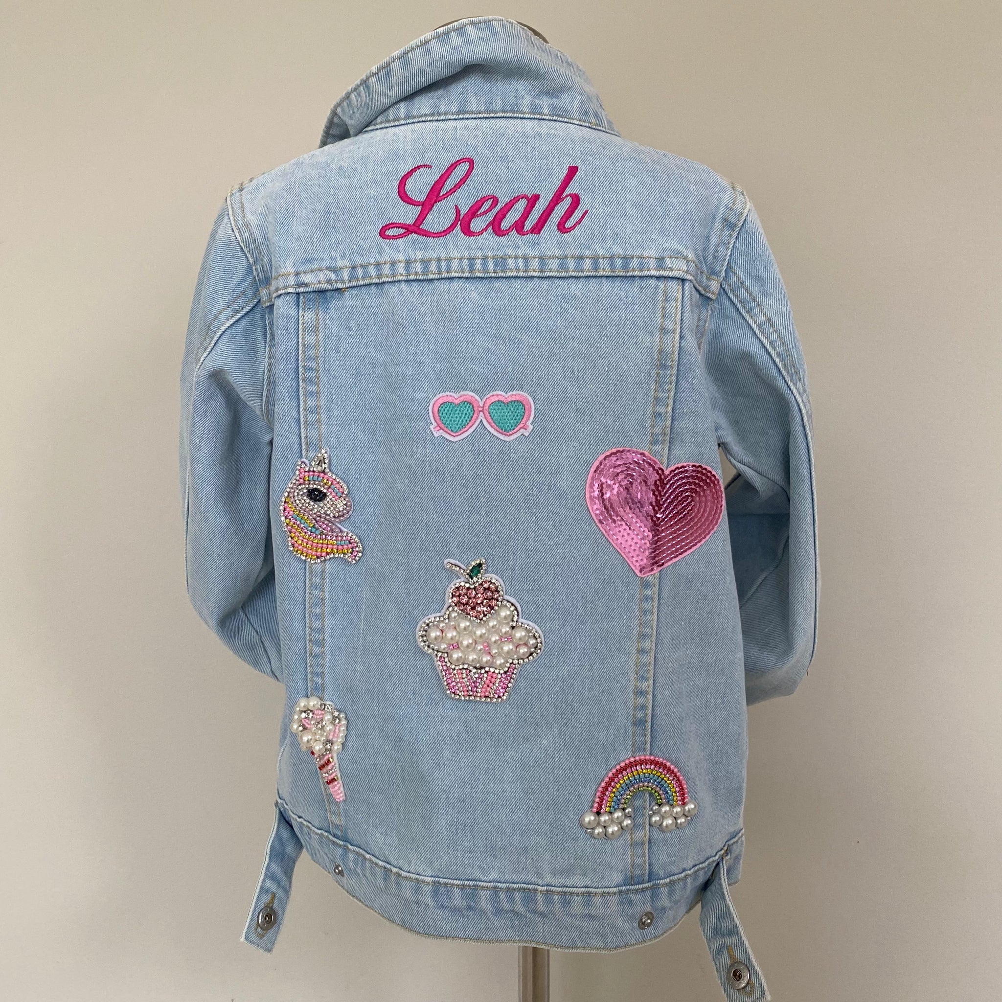 *Jacket on display in the photo is a size 7-8 in Faded Blue Denim, and the Name Personalisation Font is Script in Hot Pink thread