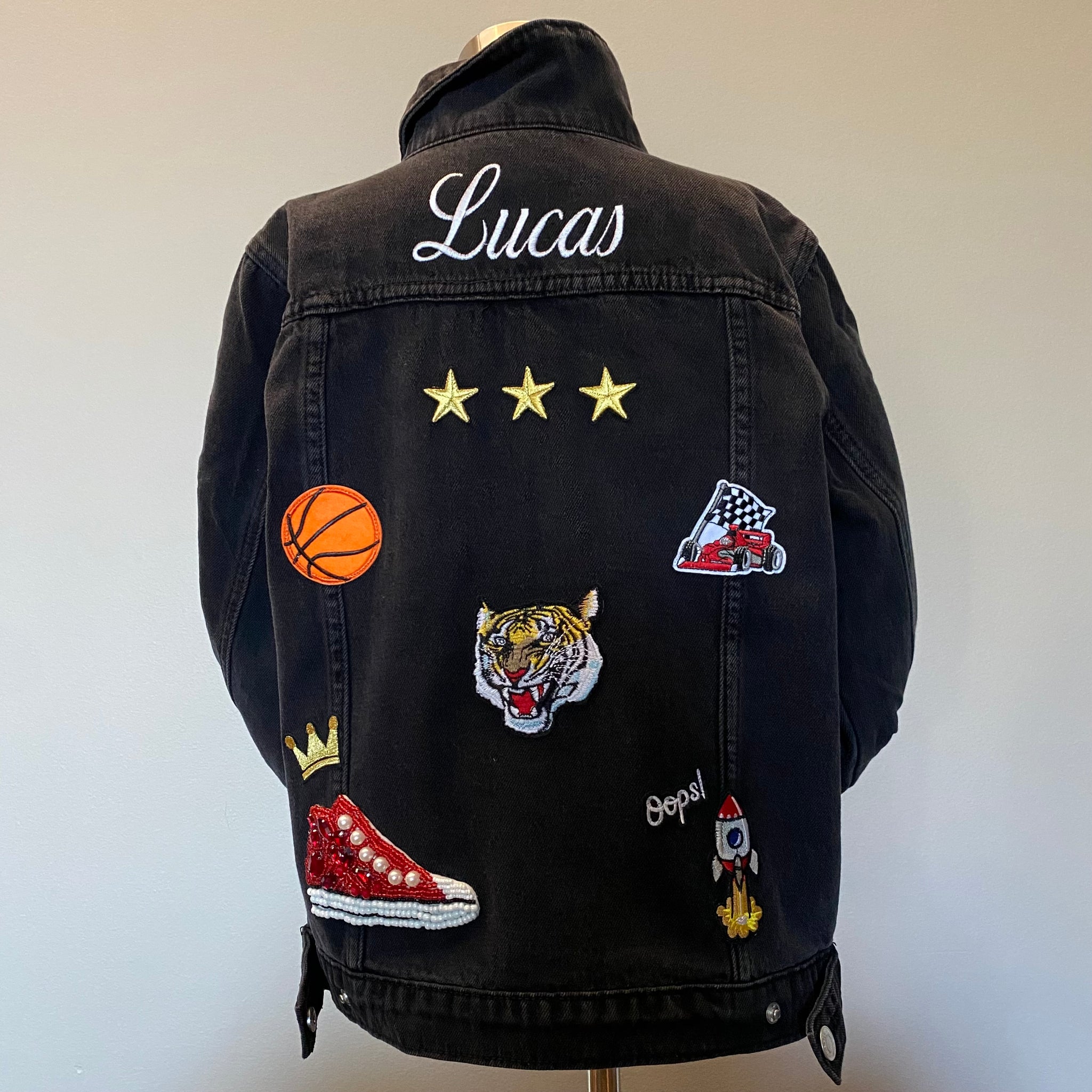 *Jacket on display in the photo is a size 9-10 in Charcoal Black Denim, and the Name Personalisation Font is Script in White thread