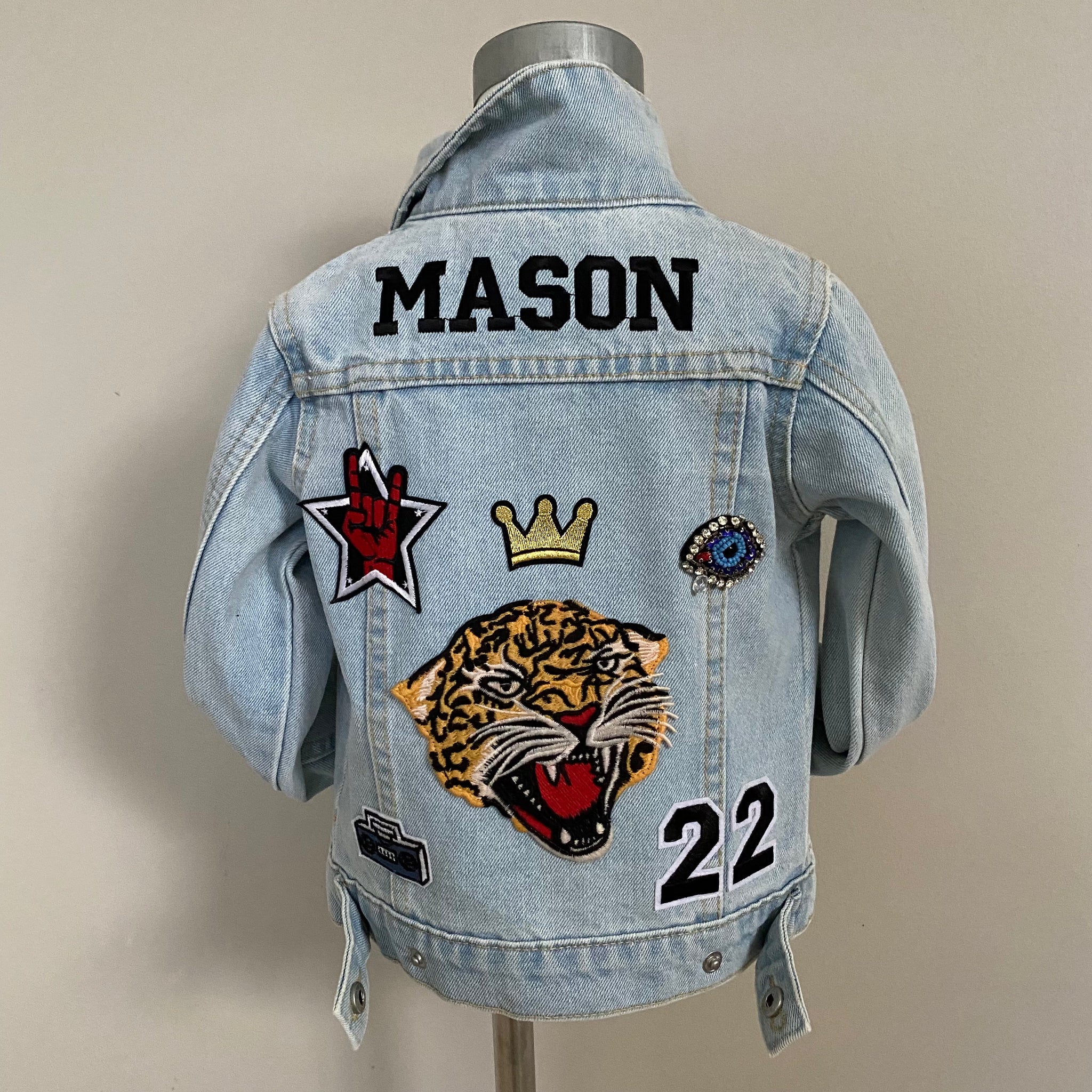 *Jacket on display in the photo is a size 1-2 in Faded Blue Denim, and the Name Personalisation Font is College in Black thread